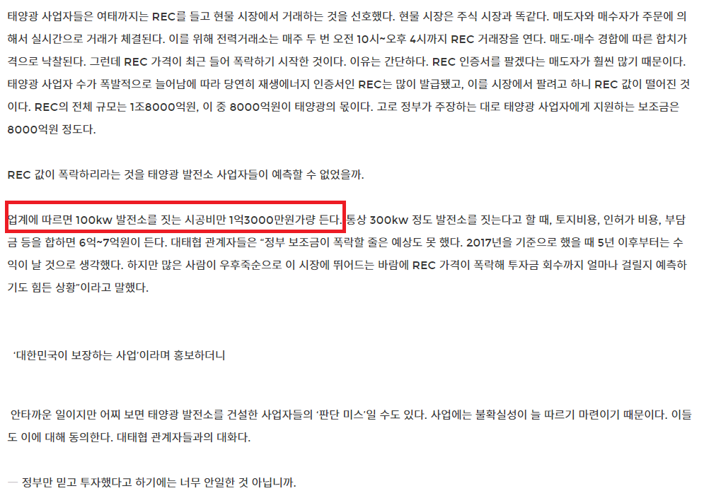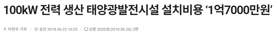 2. 한국농어민신문 기사 발췌(100KW 태양광발전시설 설치비용 1억 7000만원)