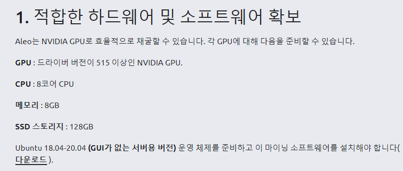 이더리움의 경우는 오직 GPU 성능만 좋으면 채굴할 수 있었는데, 알레오는 아니네요.