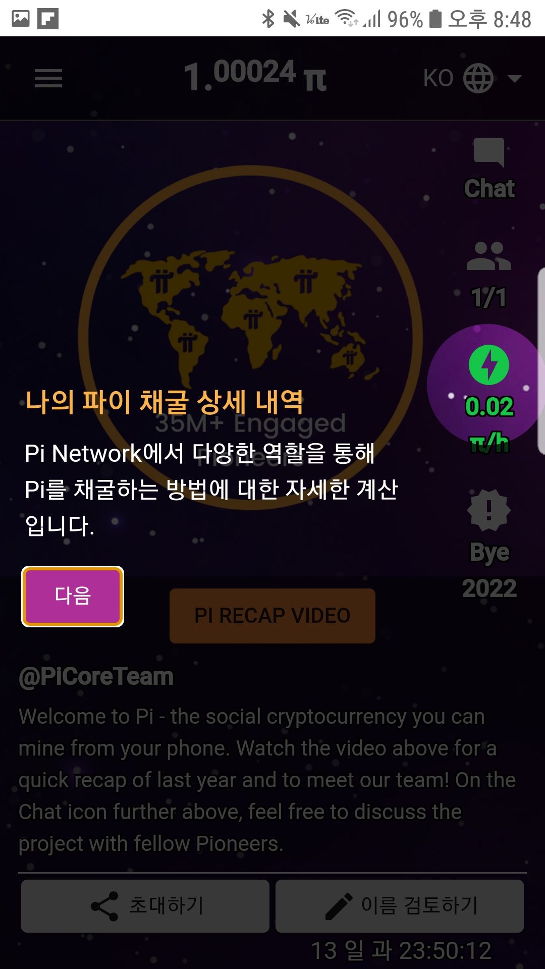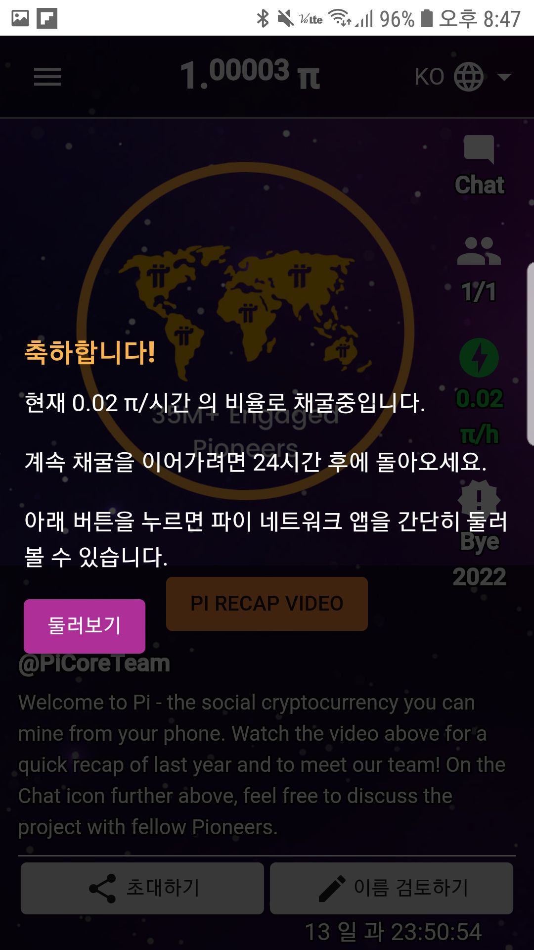10. 현재 0.02 파이/시간 의 비율로 채굴 중입니다.