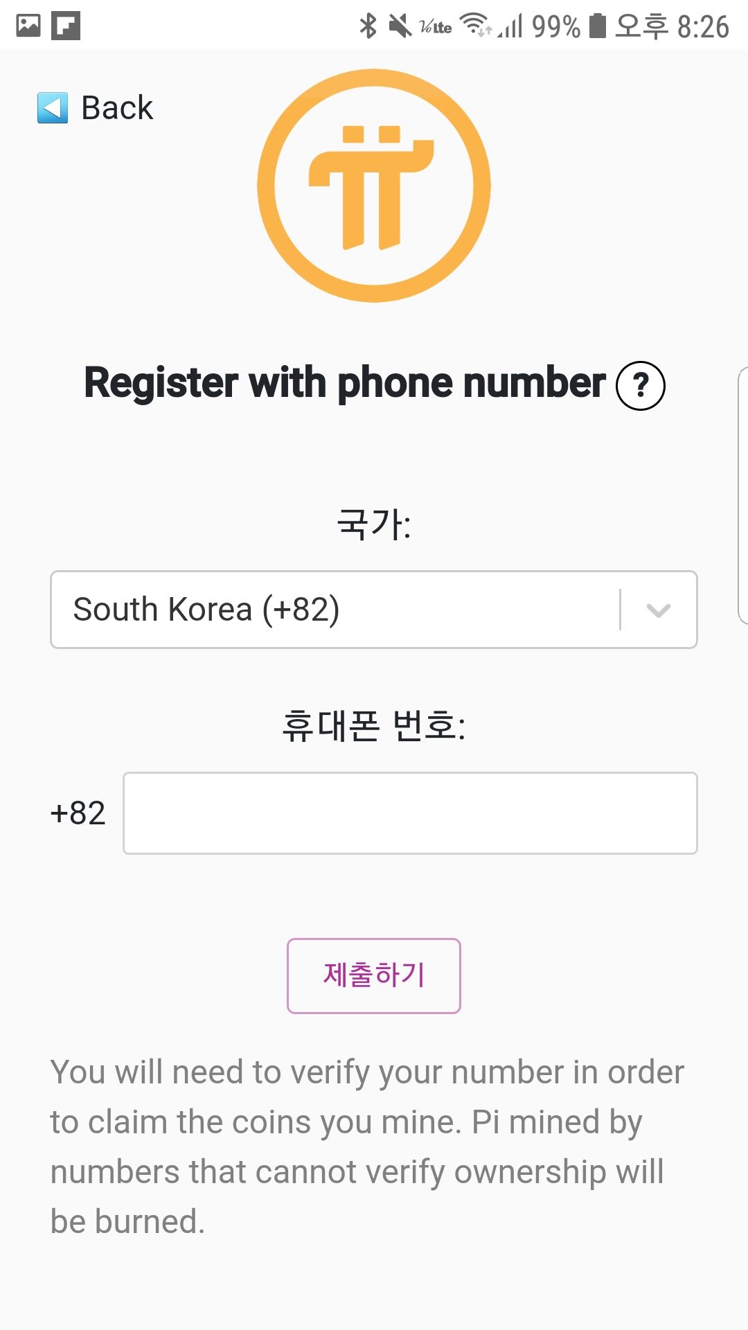 4. 국가는 South Korea(+82)로 선택하고 휴대폰 번호는 맨 앞에 0을 빼고 입력을 했습니다.