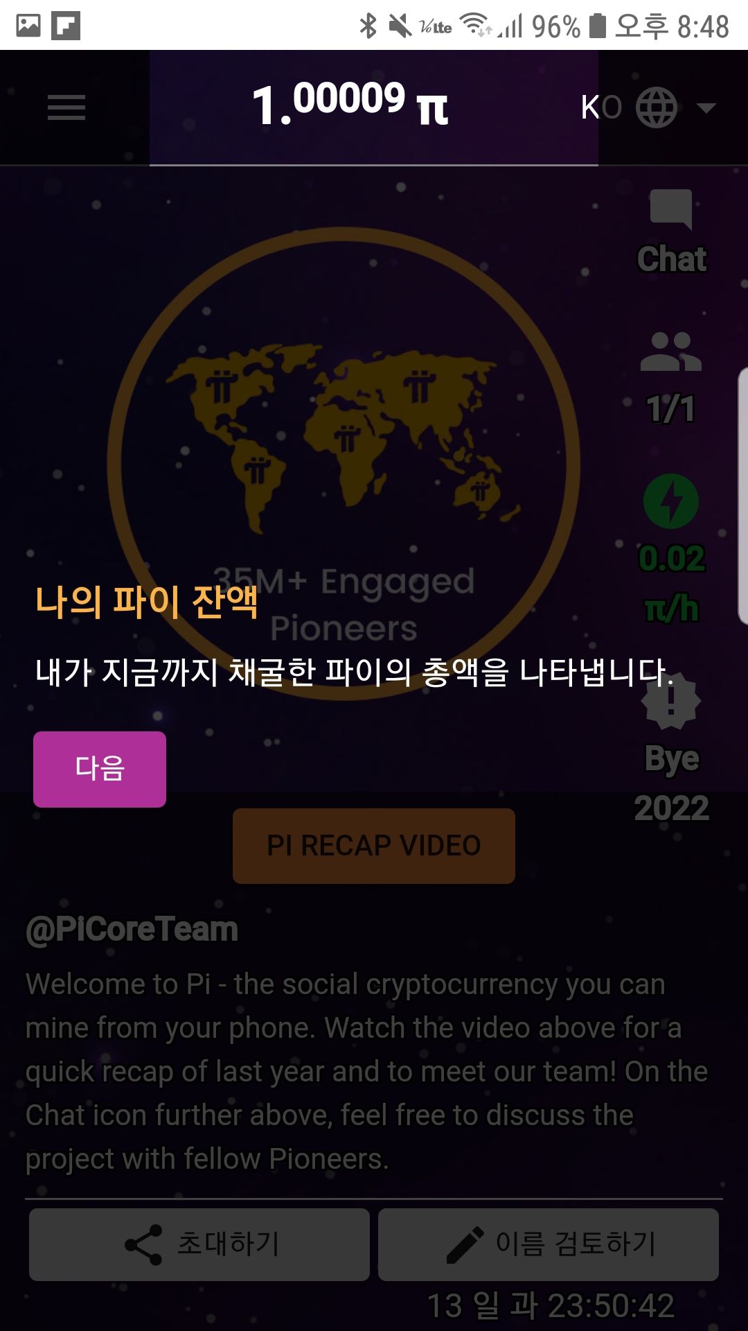 11. 잠깐 시간이 지나가니 파이코인 숫자가 1.00009 파이로 증가한 모습입니다.