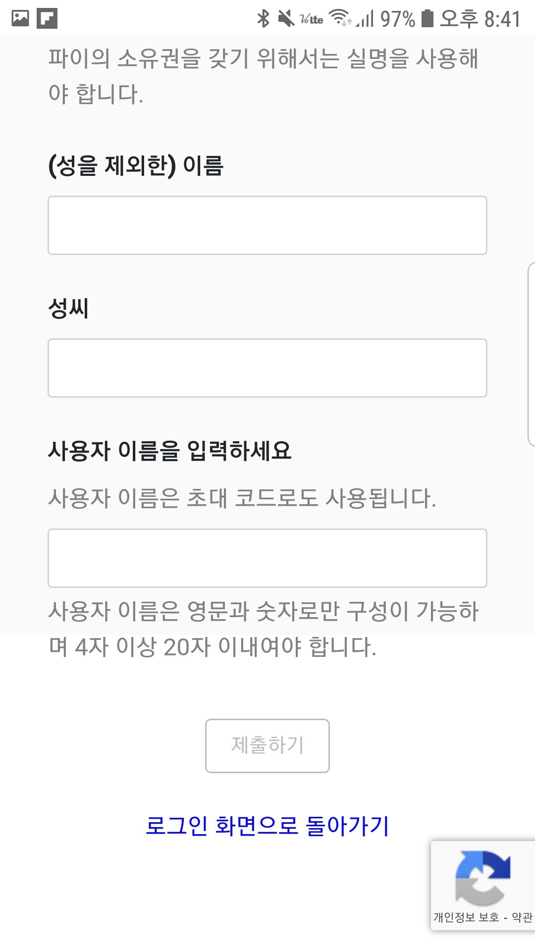 여기서 실명을 한글로 해야 할지, 영어로 해야할지 한참 고민을 했는데, 특별한 언급이 없어서 저는 한글로 입력을 하였습니다.