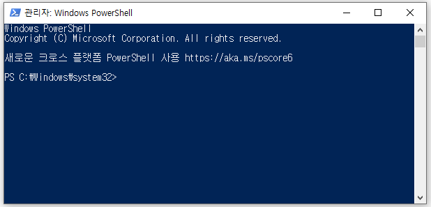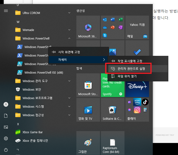 윈도우 시작메뉴에서 "Windows PowerShell"을 찾아서 마우스 우클릭을 하면 위와 같은 화면이 나올때 관리자 권한으로 실행해 주면 됩니다.