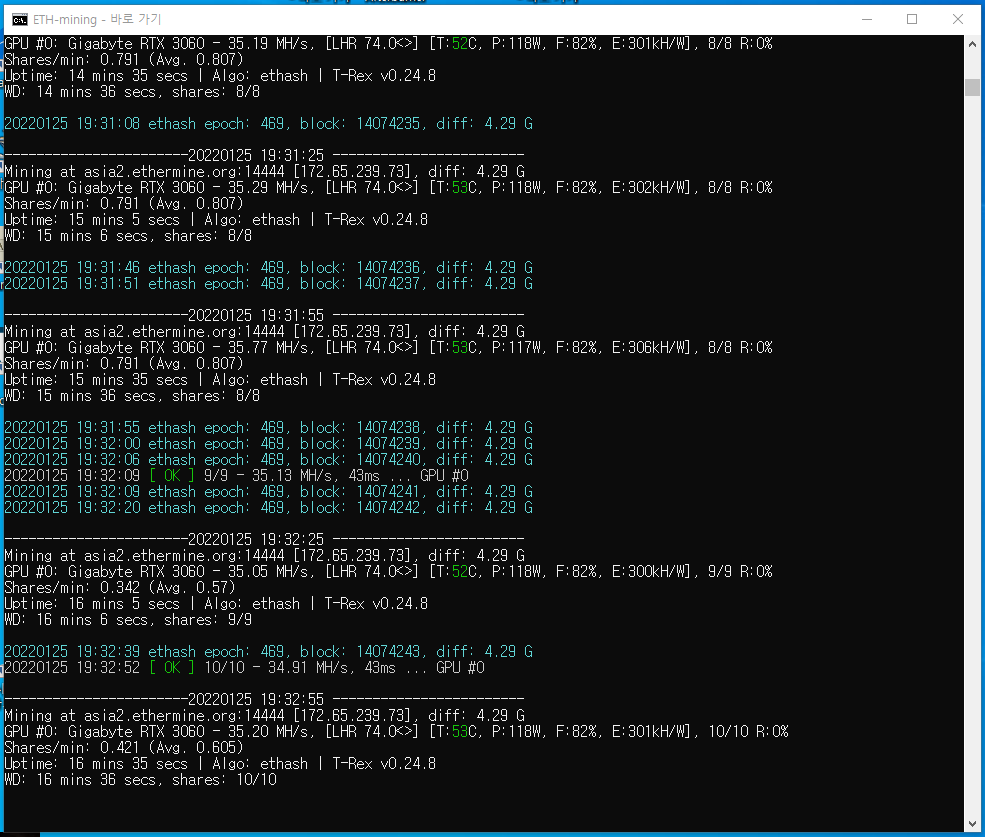 그래서 생각을 바꿔서 이더리움과 비교해 보기 위해서 채굴을 해보았습니다.