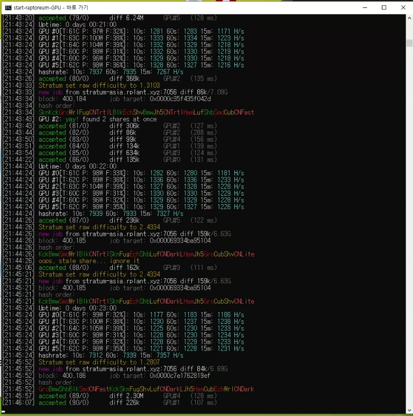 그래픽카드 6장짜리 채굴기인데요, 글카 하나당 1200 H/s 정도가 나오네요.